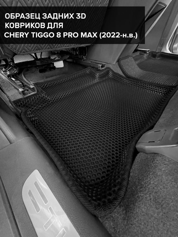 Автомобильные 3д коврики для Chery Tiggo 8 Pro Max (2022-н.в.) в салон авто и багажник сделаны из инновационного полимерного материала EVA, изысканная структура в виде ячеек не дает воде, пыли и снегу разлетаться по салону машины и багажнику. 3д коврики зафиксированы на полу определенными клипсами, соответствующими Chery Tiggo 8 Pro Max (2022-н.в.), и не двигаются в процессе езды.