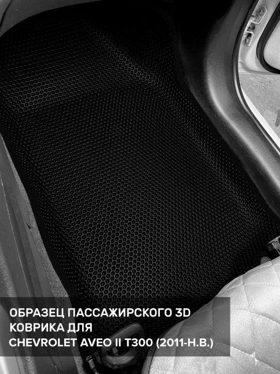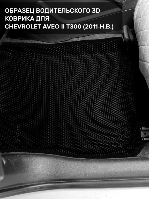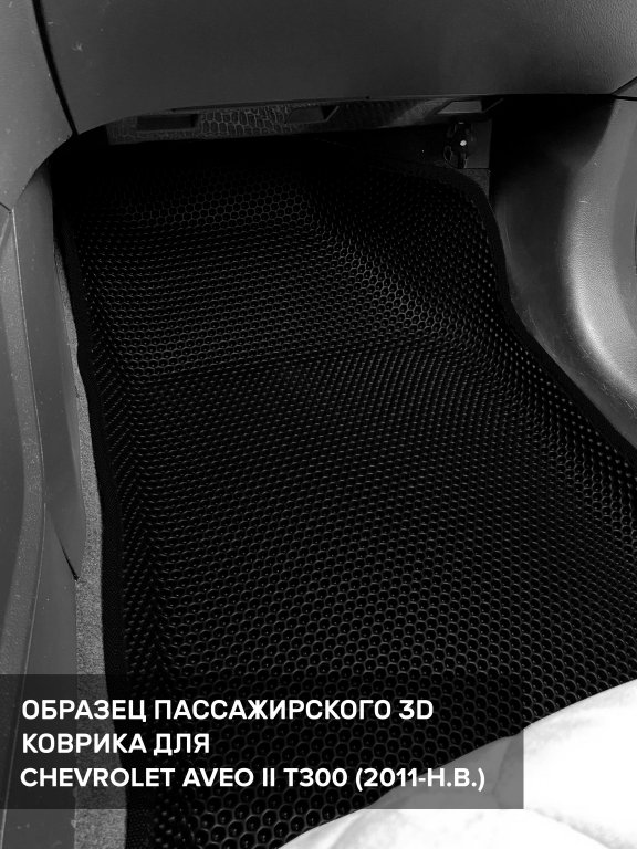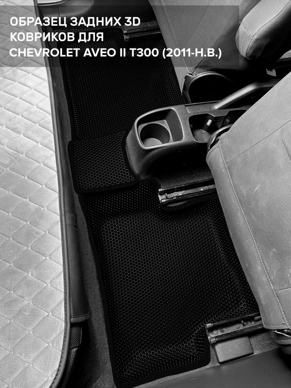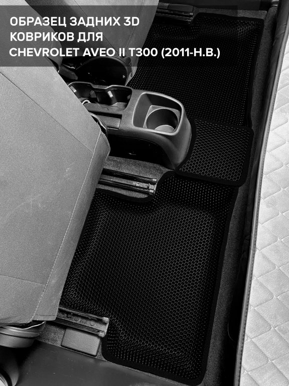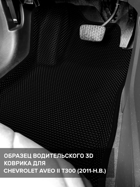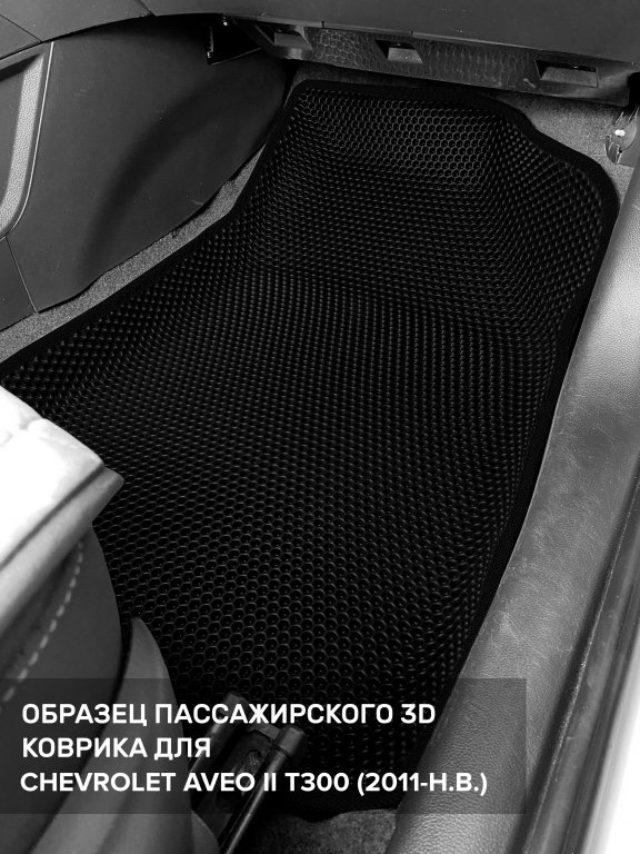 Автомобильные 3д коврики для Chevrolet Aveo II T300 (2011-н.в.) в салон авто и багажник сделаны из инновационного полимерного материала EVA, изысканная структура в виде ячеек не дает воде, пыли и снегу разлетаться по салону машины и багажнику. 3д коврики зафиксированы на полу определенными клипсами, соответствующими Chevrolet Aveo II T300 (2011-н.в.), и не двигаются в процессе езды.