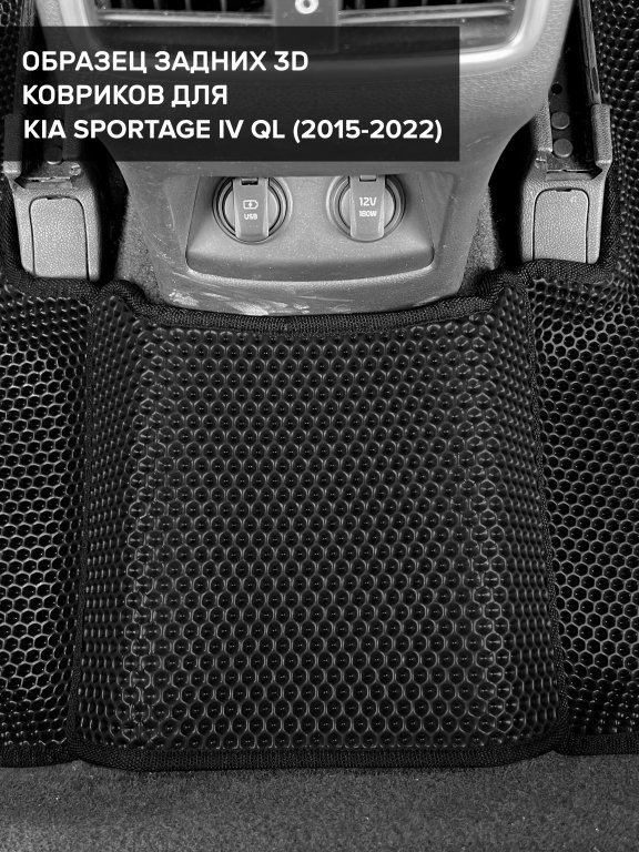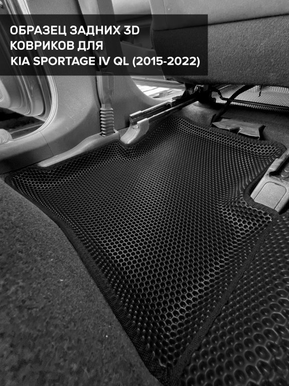 Автомобильные 3д коврики для Kia Sportage IV QL (2015-2022) в салон авто и багажник сделаны из инновационного полимерного материала EVA, изысканная структура в виде ячеек не дает воде, пыли и снегу разлетаться по салону машины и багажнику. 3д коврики зафиксированы на полу определенными клипсами, соответствующими Kia Sportage IV QL (2015-2022), и не двигаются в процессе езды.