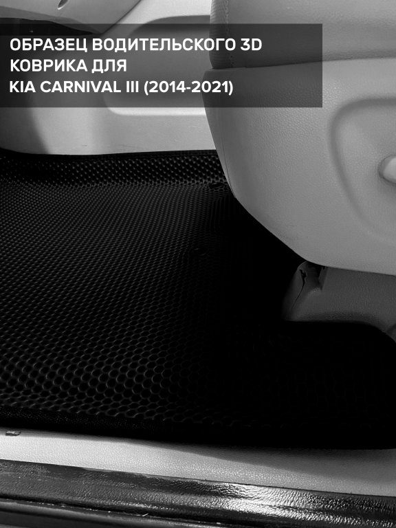 Автомобильные 3д коврики для Kia Carnival III передний ряд (2014-2021) в салон авто и багажник сделаны из инновационного полимерного материала EVA, изысканная структура в виде ячеек не дает воде, пыли и снегу разлетаться по салону машины и багажнику. 3д коврики зафиксированы на полу определенными клипсами, соответствующими Kia Carnival III передний ряд (2014-2021), и не двигаются в процессе езды.