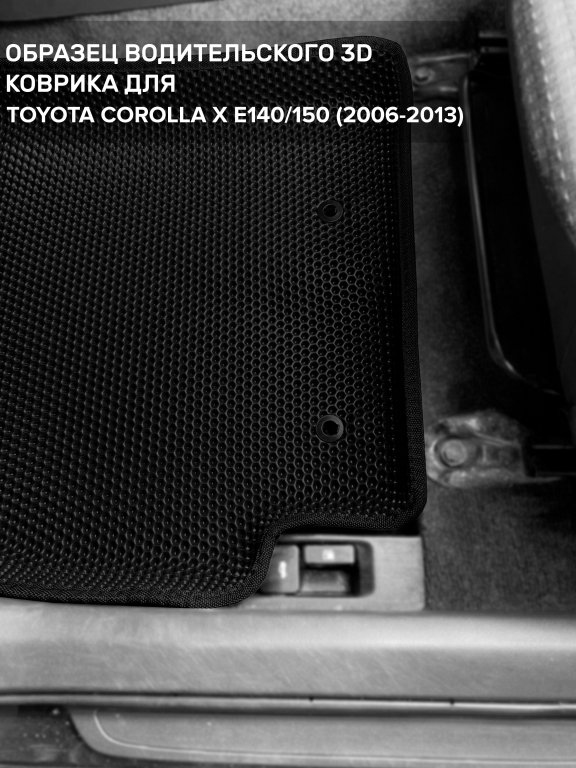 Автомобильные 3д коврики для Toyota Corolla X E140/150 (2006-2013) в салон авто и багажник сделаны из инновационного полимерного материала EVA, изысканная структура в виде ячеек не дает воде, пыли и снегу разлетаться по салону машины и багажнику. 3д коврики зафиксированы на полу определенными клипсами, соответствующими Toyota Corolla X E140/150 (2006-2013), и не двигаются в процессе езды.